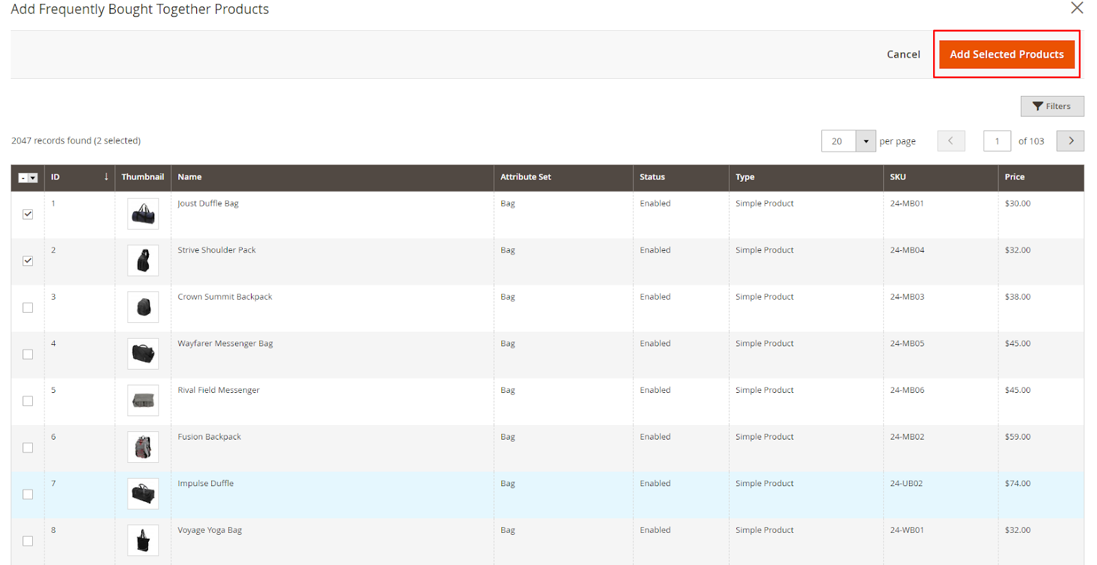 - On the Add Frequently Bought Together Products page, tick the Products you want to add