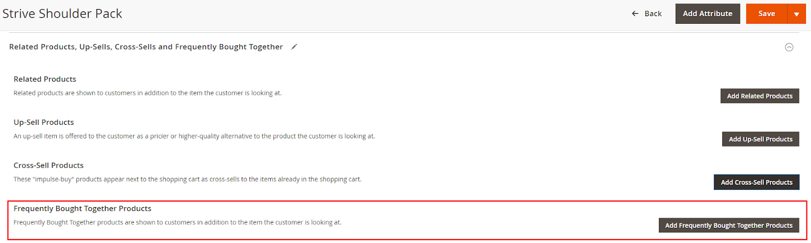 - Under Related Products, Up-Sells, Cross-Sells and Frequently Bought Together on Edit Product page, select Add Frequently Bought Together Products. Note: You must Enable the extension to see the Frequently Bought Together Product section.