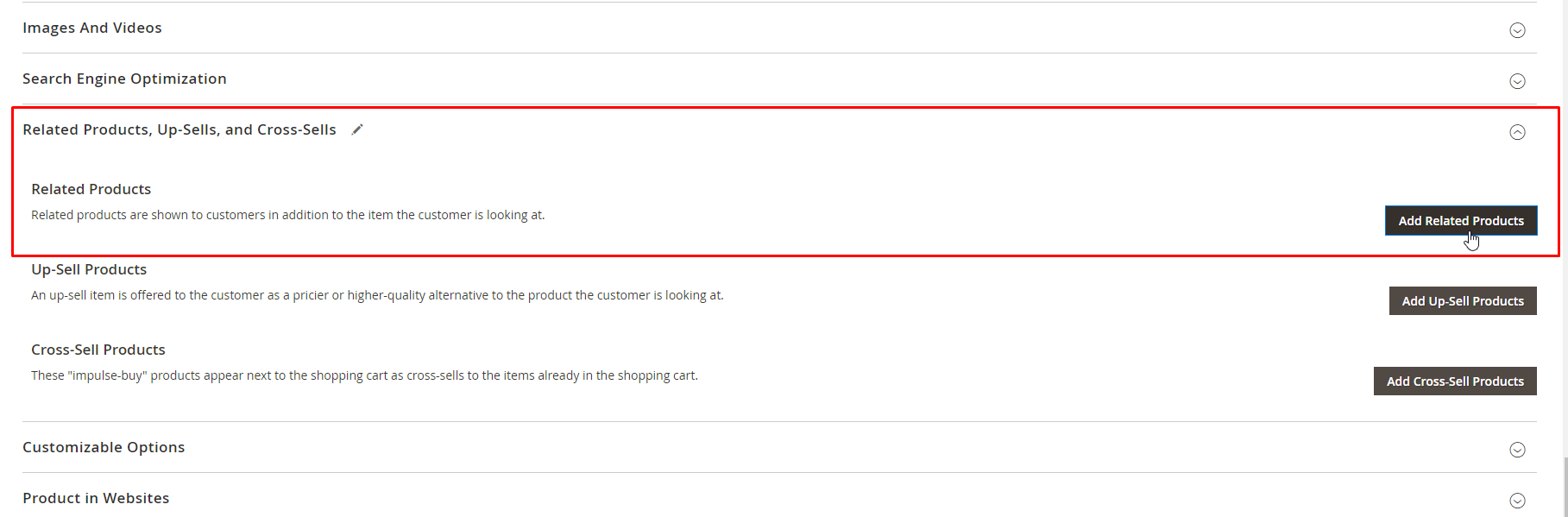 - Scroll down until the Related Product, Up-sells, and Cross-sells reaches your eyesight, choose black Add Related Product button.