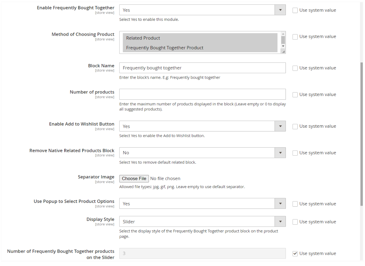 From the Admin Panel, go to Stores > Settings > Configuration > Mageplaza Extension > Frequently Bought Together, choose General Configuration sections