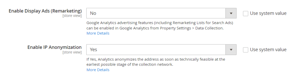 Enable Display Ads (Remarketing): Select Yes to enable Google Analytics advertising features (including Remarketing Lists for Search Ads) that can be enabled in Google Analytics from