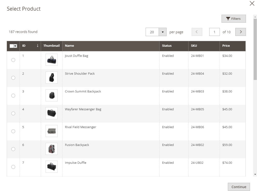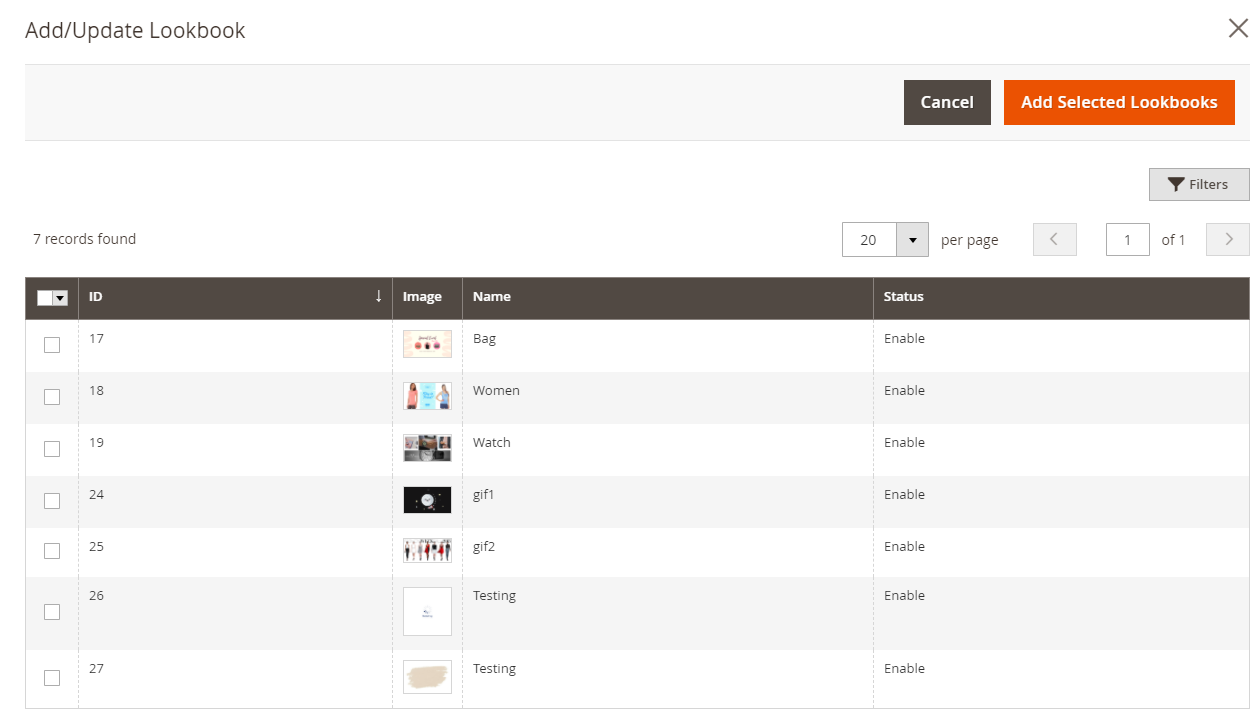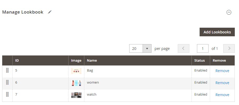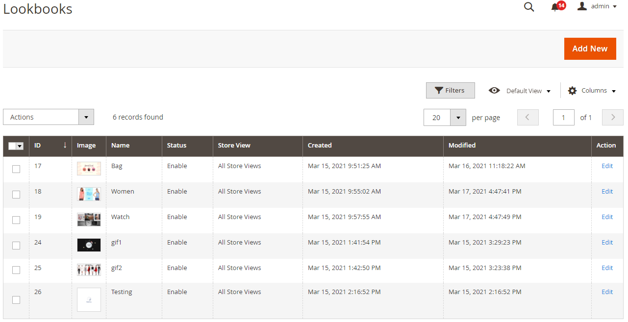 - At the grid, admins can view all general information of lookbooks such as ID, Image, Name, Status, Store View, Created, Modified.
