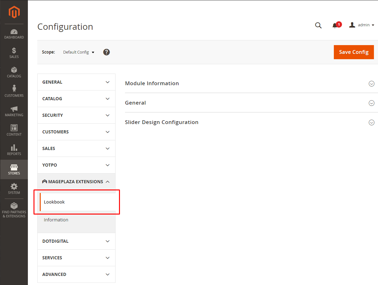 Log in your backend, choose Content > Lookbook Sliders > Configuration or Stores > Settings > Configuration > Mageplaza Extensions > Lookbook
