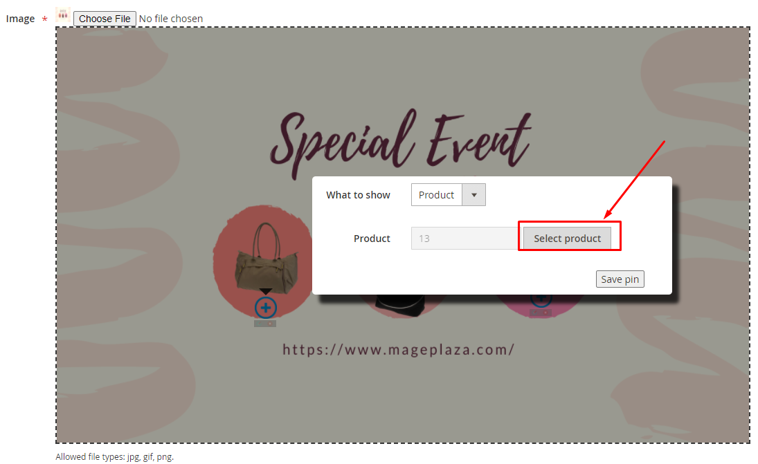 - Select product: Select the products that are shown on the lookbook. Click Save pin to save the information