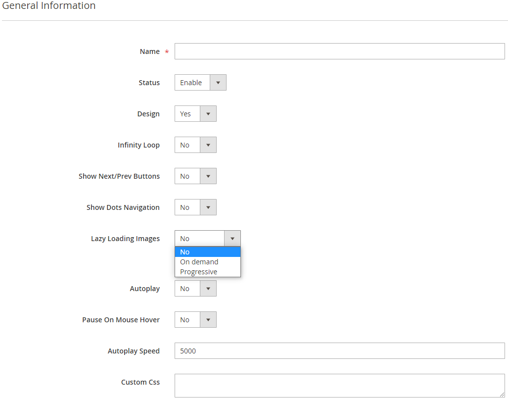 Autoplay: Select Yes to automatically move the lookbooks to the left with the time set at Autoplay Speed. When Yes selected, the Autoplay Speed and Pause On Mouse Hover fields are displayed.