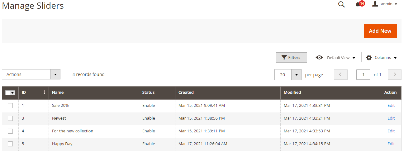 - Edit: Select Edit at the Action column to display the slider page and edit the slider information