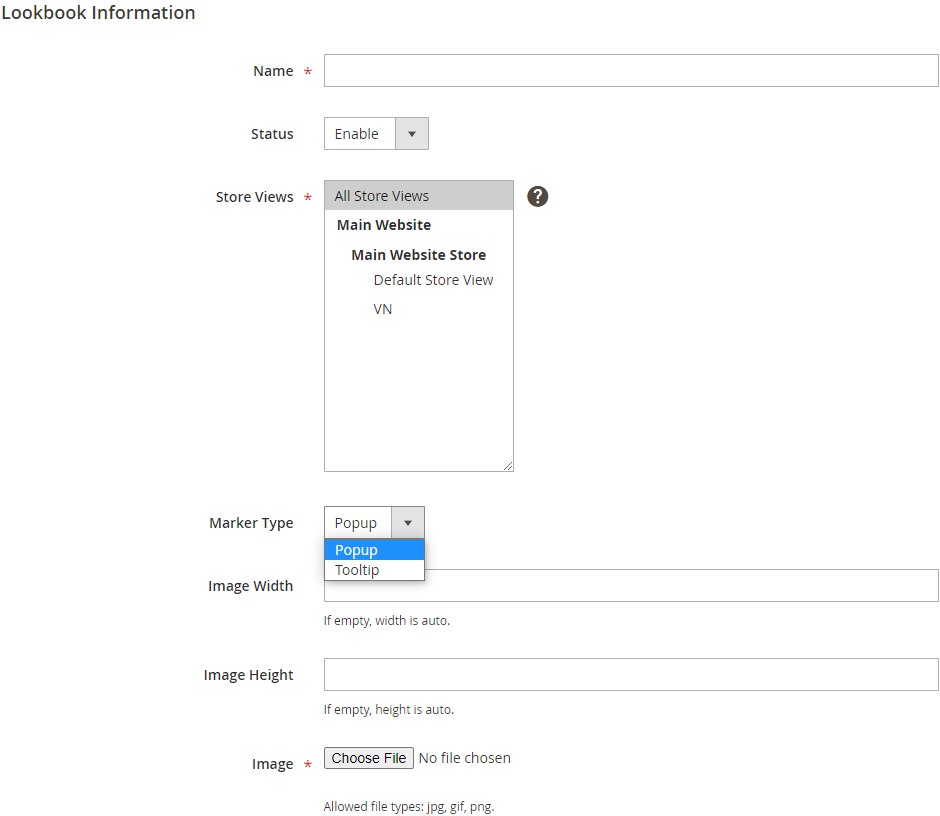 - Image: Select images with file type: jpg, png, gif. This a required field so you need to select images to save the lookbook