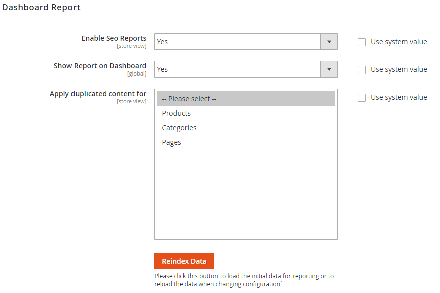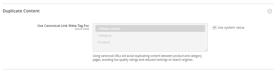 The Dupplicate Content section is now optimized. Category and Products are included in the “ Use Canonical Link Meta Tag For” field. Using canonical URLs will avoid duplicating content between product and category pages, avoiding low quality ratings and reduced rankings on search engines.