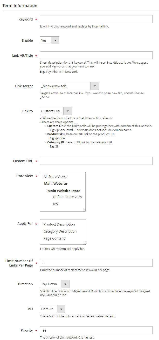 In the Priority field: Set up value for the priority of this keyword. Higher priority term will be applied first. 0 is the highest.