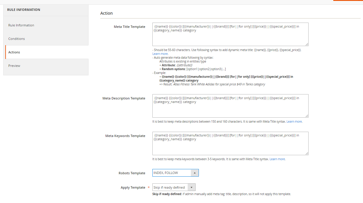 The rule form and its action of the rest Category Pages, CMS Pages or Layered Navigation is pretty similar to the Product Page’s form