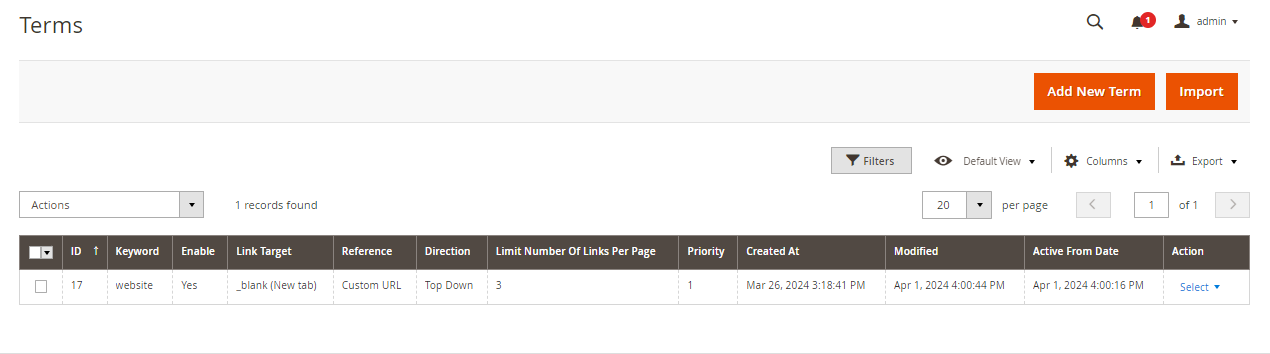 The “Active from Date” and “Created at” columns are added in the Term Grid.